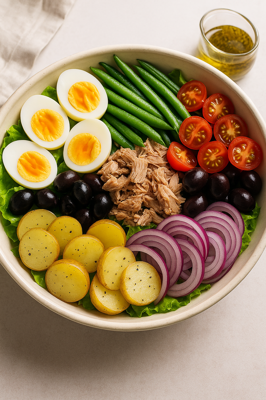 - برای اینکه تخممرغ آبپز سالاد نیسواز زردهای زرد و بدون هاله خاکستری داشته باشه، بعد از جوشیدن ۸ دقیقهای، سریع اون رو در آب یخ بگذارید.
